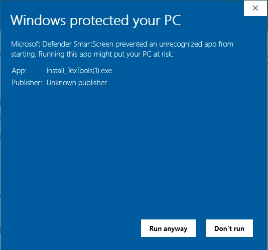 - Click More Info to procede further then click the Run Anyway button. At the time of writing this, the file is safe. This website however, wishes to cover its own ass and tell you that its not responsible for the content on the ffxiv-textools.net website =).